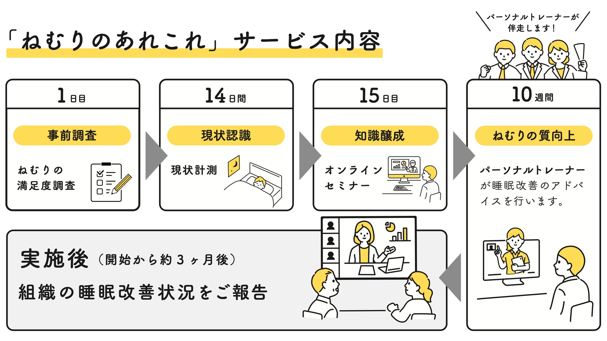 裏を返すと、睡眠負債の解消は業務における生産性向上と健康の維持・向上につながる施策であり、「ねむりのあれこれ」は、睡眠センサーと専門家による睡眠のパーソナルトレーニングで従業員の睡眠改善をサポートし、睡眠負債の解消をめざします。