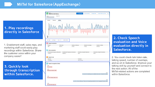 - MiiTelでの会話録音をSalesforce上で再生できます。録音した会話は、すぐにSalesforce上で確認することで、振り返りを迅速に行えるようになります。また、MiiTelでの会話録音をSalesforce上で再生速度を調節して再生できます。