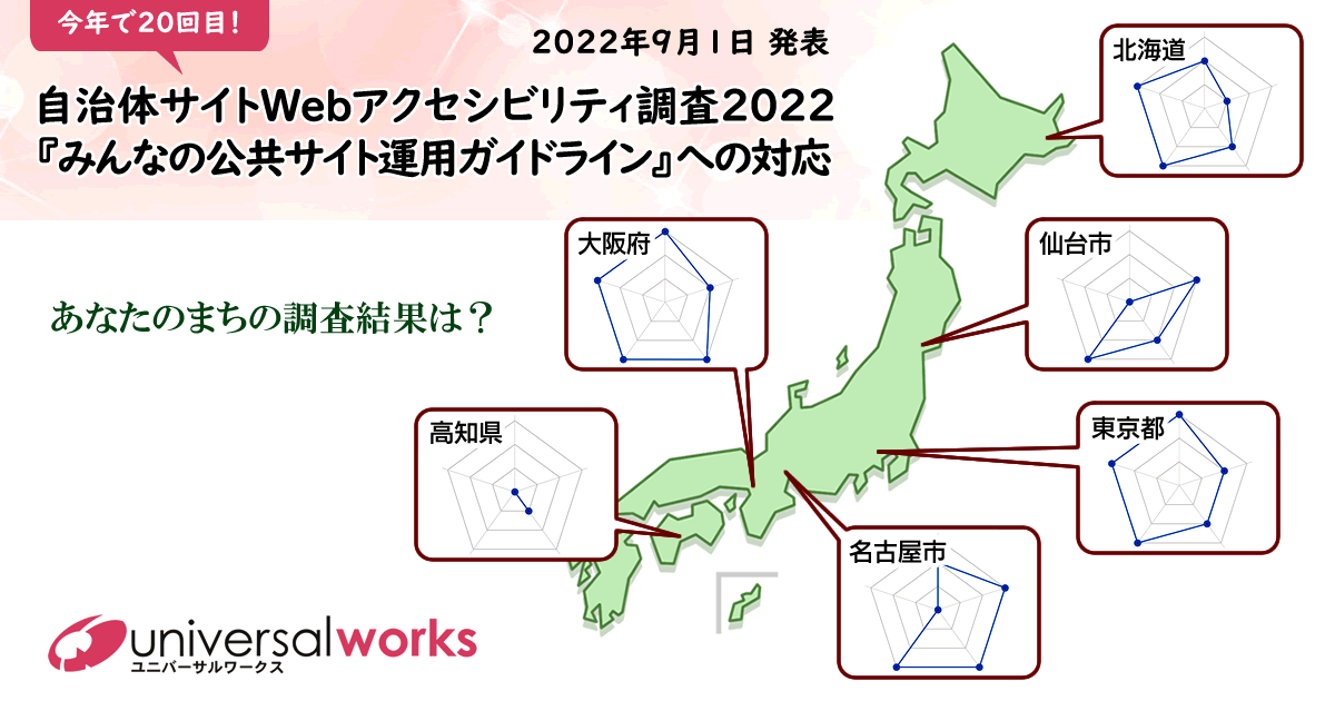 有限会社ユニバーサルワークス(静岡県三島市・代表取締役 清家順)は、「自治体サイトWebアクセシビリティ調査2022」を実施しました。今年で20回目となる今回、総務省が示している「みんなの公共サイト運用ガイドライン」を題材として、47都道府県・20政令指定都市の自治体サイトのアクセシビリティ(障害のある方や高齢者を含む誰もがアクセスできること)を評価しました。