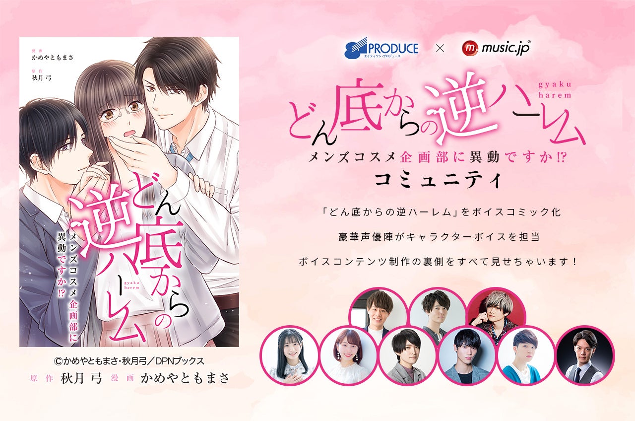 本コミュニティは、人気コミック『どん底からの逆ハーレム~メンズコスメ企画部に異動ですか!?~』を原作としたボイスコミックの制作過程を公開する期間限定のオンラインコミュニティです。ボイスコミックには81プロデュース所属の人気声優である神尾晋一郎さん、駒田航さん、榊原優希さんらが参加し、ヒロイン役などの配役が公開オーディションで決定します!コミュニティメンバーには、完成したボイスコミックの先行視聴や、制作プロセスにおけるコメント発信、さらに抽選で参加できるオーディション見学など、メンバーならではの特典が満載です。