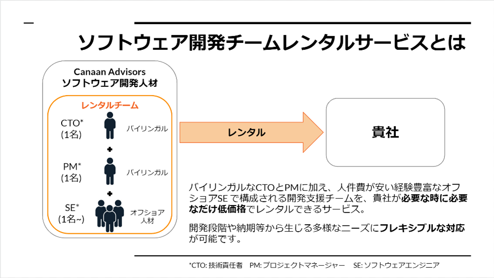 一般的なソフトウェア開発発注サービスの場合、ジュニアエンジニアは少なくとも月に40~60万円/人かかります。ジュニアエンジニア一人に開発を丸投げできないため、シニアエンジニアもしくはCTOを加えるとなると月に100~160万円/人かかります。そのため、開発チームを編成するとなると月々数百万円が容易にかかってしまい、スタートアップや新規事業開発の担当者がアイデアを実現するにあたり大きな障壁となっています。そこで当社では、バイリンガルなCTOとPMが人件費の安いオフショアSE人材とタッグを組み、円滑なコミュニケーションを取ることで、最小規模で月額28万円/チーム〜という、業界最安値での開発を可能にします。スタートアップや新規事業開発に立ちはだかる高額な開発費の障壁を取り除くことで、日本のイノベーションを活性化させることをミッションとして今回のリリースに至りました。