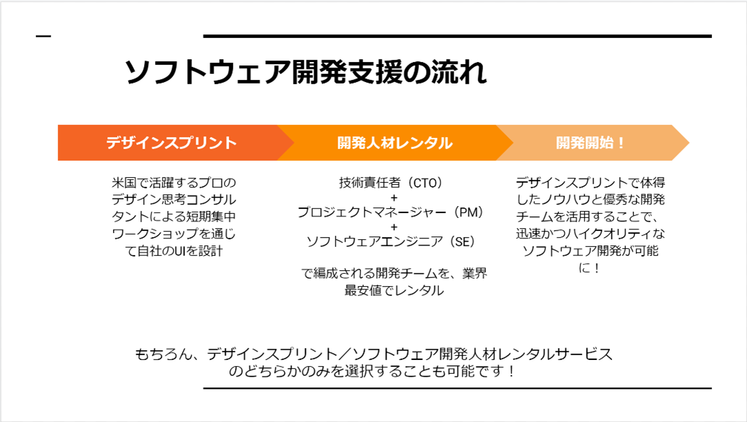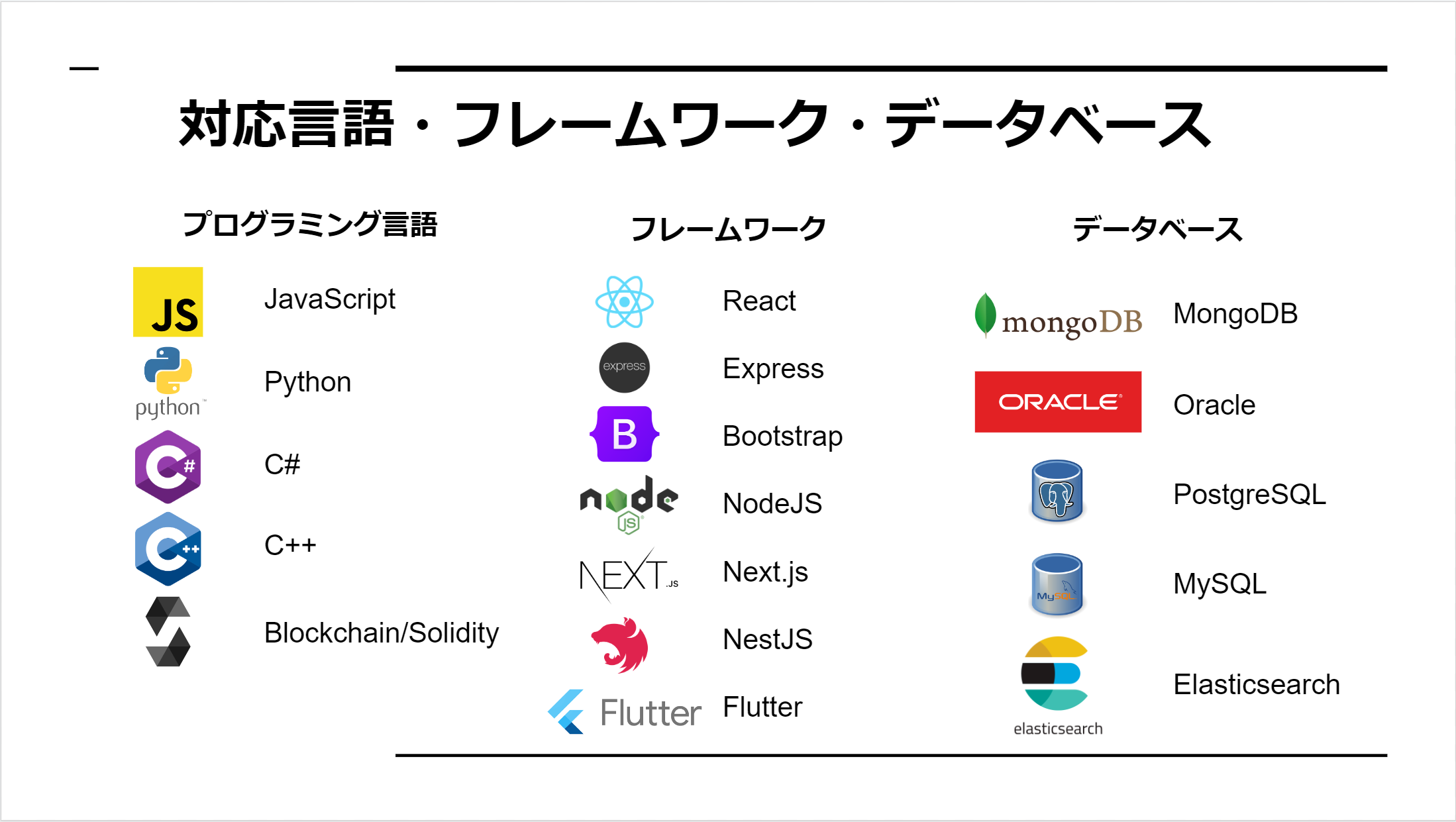 デザインスプリント/ソフトウェア開発チームレンタルサービスのどちらかのみを選択することも可能です。また、当社は多様な専門性を持った人材を抱えているため、プログラミング言語・フレームワーク・データベースにおいて、各企業様の様々なニーズに対応することが可能です。ブロックチェーンを含む先端分野への専門知識も提供が可能です。