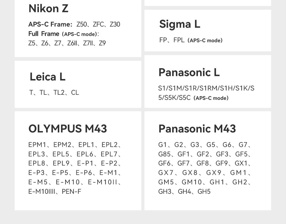 - レンズマウント:Z、M4/3、X、E、L