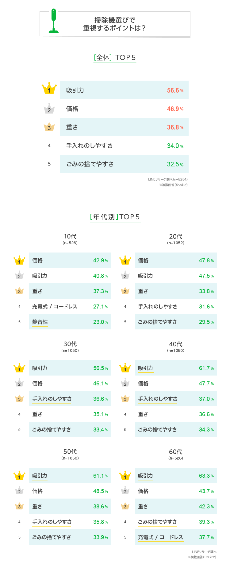 男女別にみると、「吸引力」「重さ」「手入れのしやすさ」「ごみの捨てやすさ」は、男性と比べて女性の割合が高くなっていました。60代女性では「重さ」「ごみの捨てやすさ」が「価格」よりも上位にランクインしました。