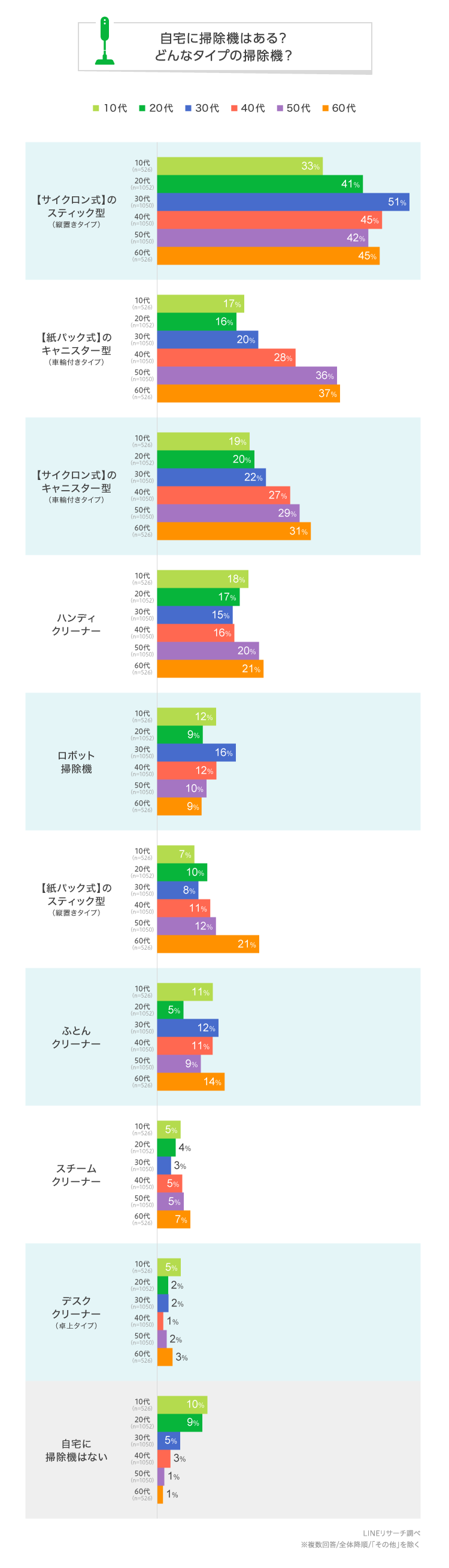 一方、40~60代では「【紙パック式】のキャニスター型」が2位。年代が上がるほど高くなる傾向にあり、60代でもっとも高い割合でした。