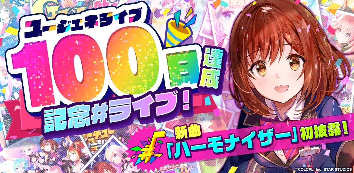 『ユージェネライブ』にリニューアルしてから、無事100日目の#ライブを迎えます。これも皆様の暖かいご声援のおかげです。これを記念して、9月8日(木)より5夜連続記念#ライブを開催いたします。今回は歌唱パート中心の#ライブとなっており、新曲「ハーモナイザー」をお届けいたします。5日間にわたる#ライブをお楽しみください。また、期間限定ログインボーナスも実施いたします。期間中5日間ログインすることで合計1000アスタジェムをプレゼントいたします。
