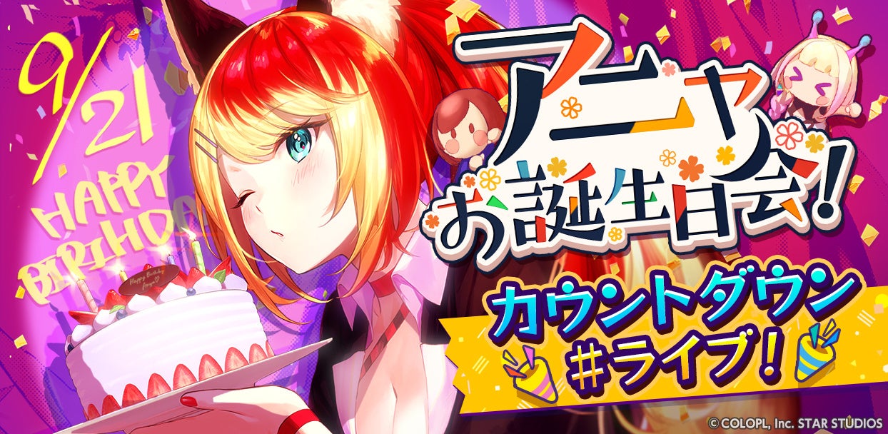 9月17日(土)より、「アニャ誕生日カウントダウン!」を開催いたします。さくら、コズミ、ノラン、モアカが順番にアニャの誕生日までのカウントダウン#ライブを行い、誕生日当日には「アニャお誕生日会#ライブ」をお送りいたします。