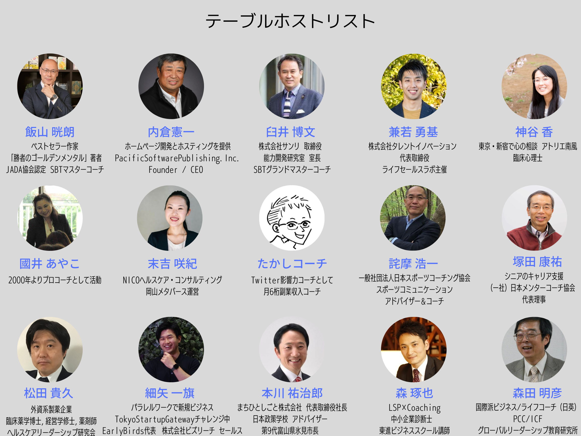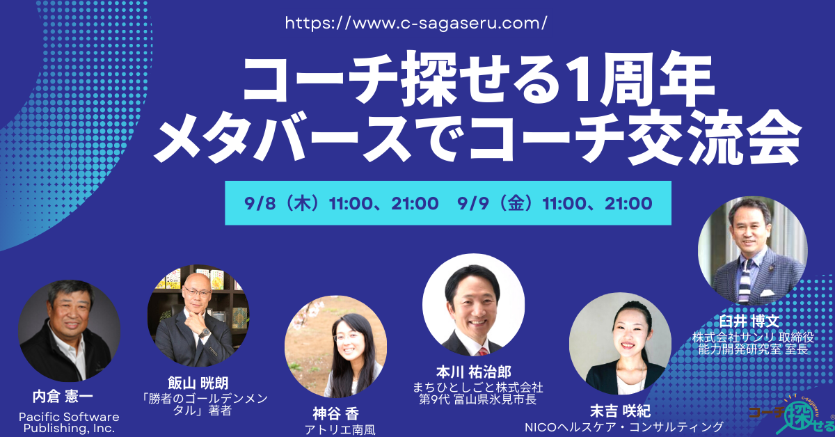 9月は「コーチ探せる」1周年に感謝を込めて、多様なジャンルで活躍する方をテーブルホストにお招きし、どなたでも参加可能なメタバース空間での交流イベントを開催します。