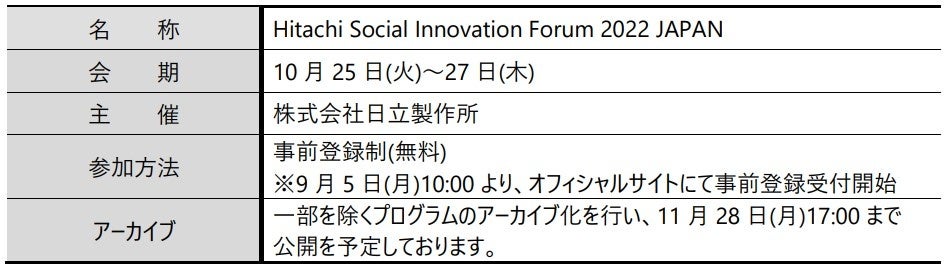 株式会社日立製作所(以下、日立)は、グローバルな社会イノベーション事業を通じた持続可能な社会の実現をめざし、お客さまやパートナーとの協創に向けたきっかけ作りの場として、10月25日(火)から27日(木)の3日間、日立グループにおける最大規模のイベントである「Hitachi Social Innovation Forum 2022 JAPAN」を開催します。