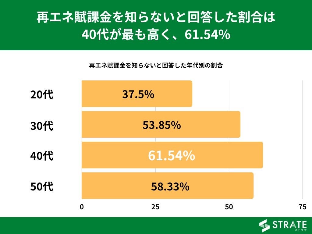 再エネ賦課金を知らないと回答した割合を年代別でみてみますと、40代が61.54%、次いで50代が58.33%、20代は37.5%という結果になりました。
