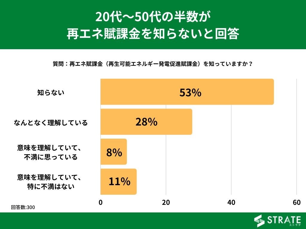 20代~50代の男女を対象とした「再エネ賦課金(再生可能エネルギー発電促進賦課金)を知っていますか?」というアンケートで最も多かった回答は「知らない」で53%でした。