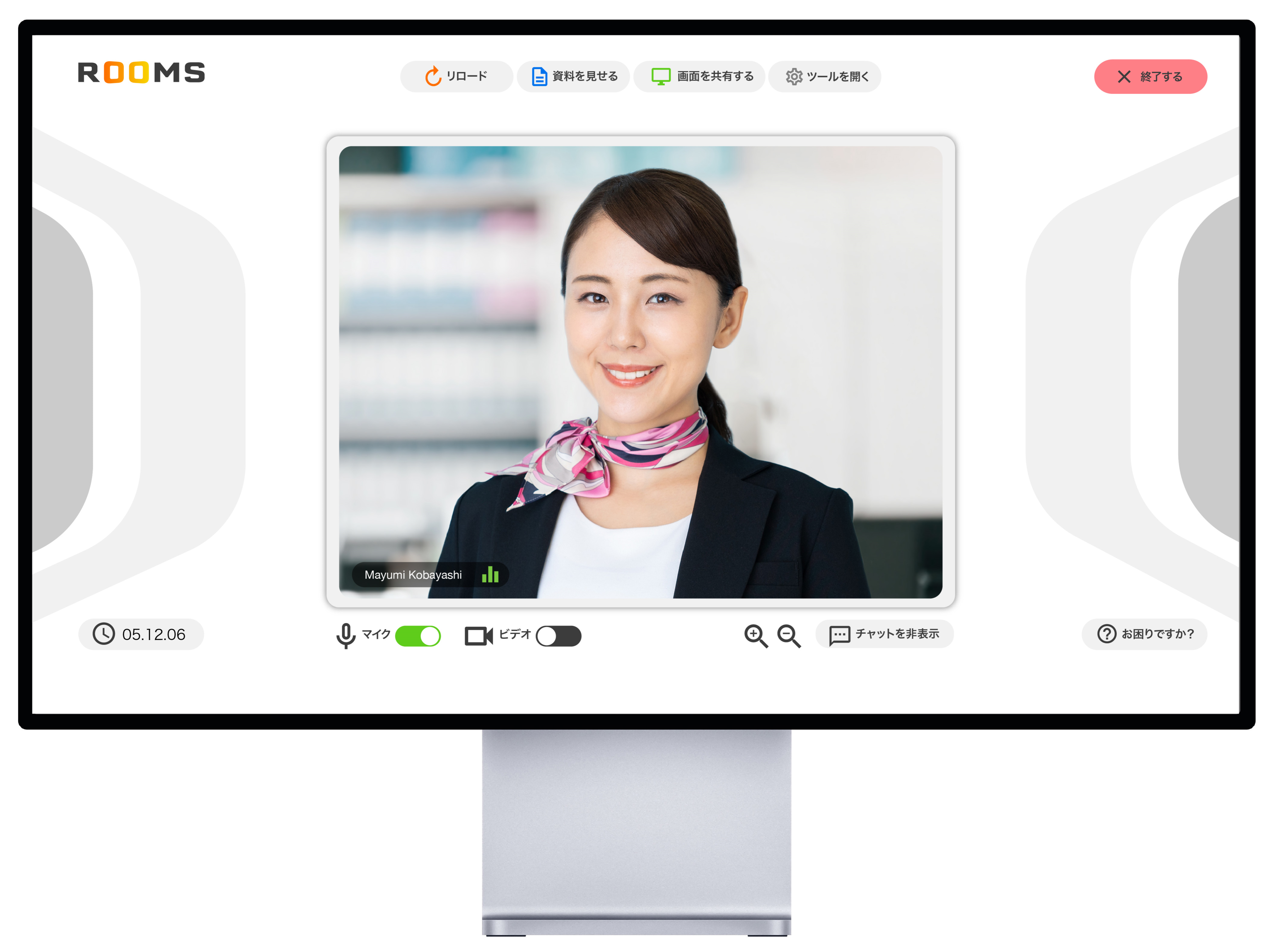 「ROOMS」は、国産のオンライン接客専用システムです。ZoomやTeamsといった海外産Web会議ツールとは異なり、日本の接客シーンに特化した機能・おもてなし要素を豊富に搭載しております。