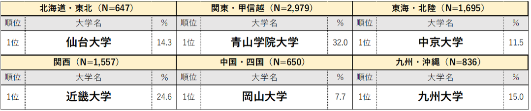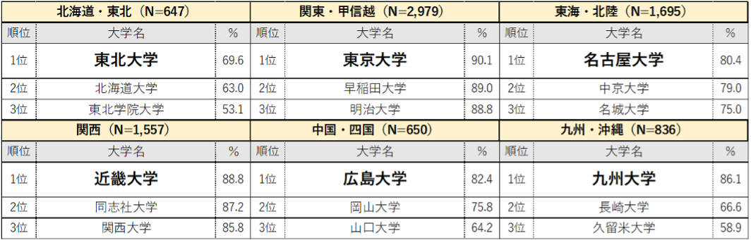 全国の大学認知度ランキングでは、関西を除く各エリアで、国立大学が認知度ランキング1位を獲得する結果となった。一方、関西では私立大学である近畿大学が1位を獲得した。