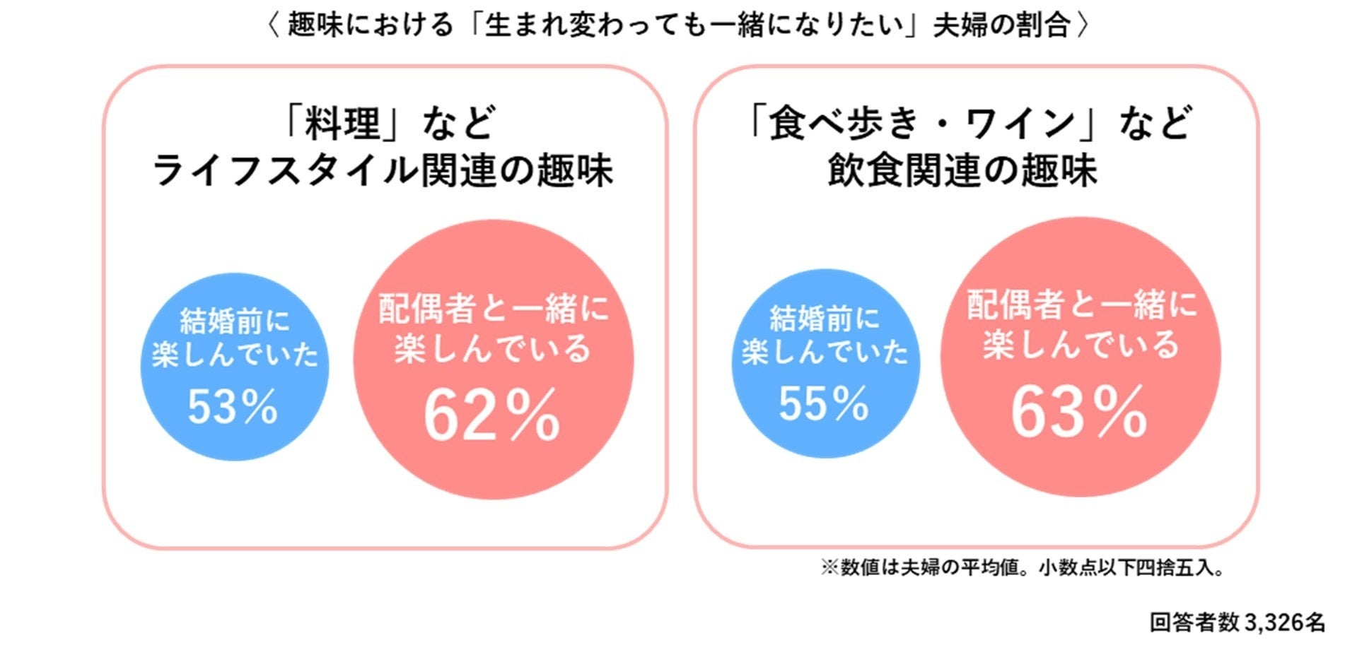 「料理を含むライフスタイル関連の趣味 」や「 食べ歩きやワインといった飲食関連の趣味 」は、結婚前に趣味にしていた人よりも 、結婚後に夫婦一緒に楽しんでいると回答した人のシアワセ夫婦割合はアップ!趣味においても、「 夫婦一緒に 」が幸福感をアップすることにつながる傾向があることがわかりました 。