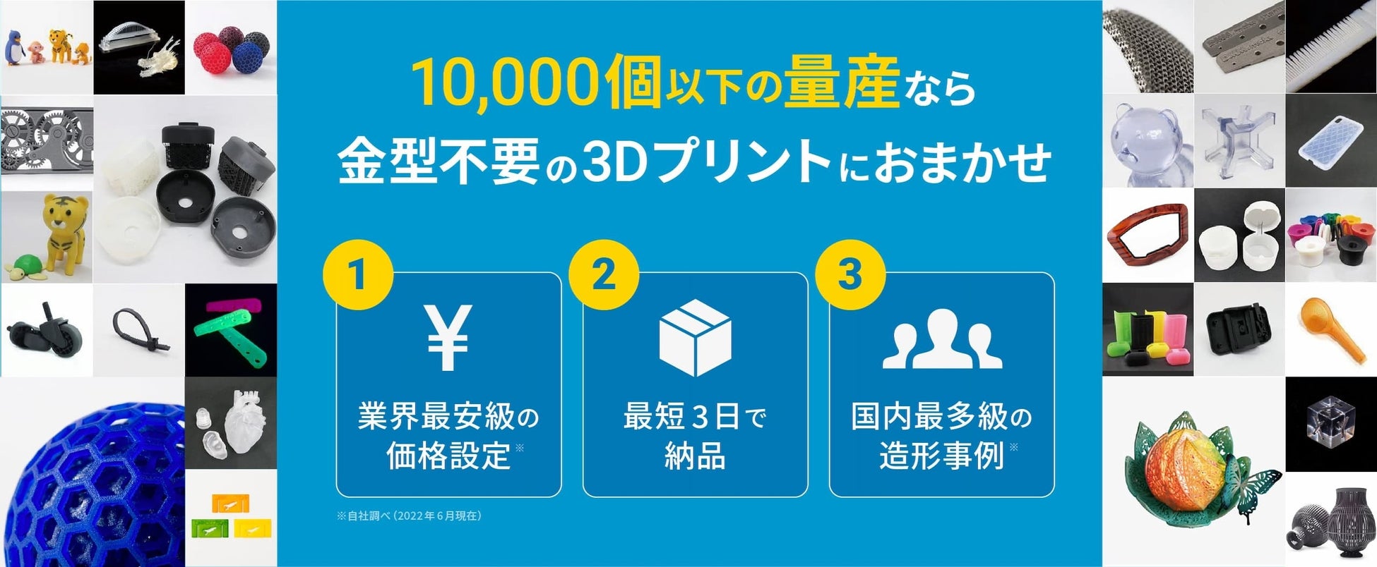 今後は、増加する量産要望に対応すべく、生産体制を強化していくとともに、気軽に3Dプリントを活用した量産をご検討いただけるよう「量産時の特別法人割引(※1)」を実施し、ものづくりの選択肢の一つとして3Dプリントをご利用いただきやすい環境を整備してまいります。
