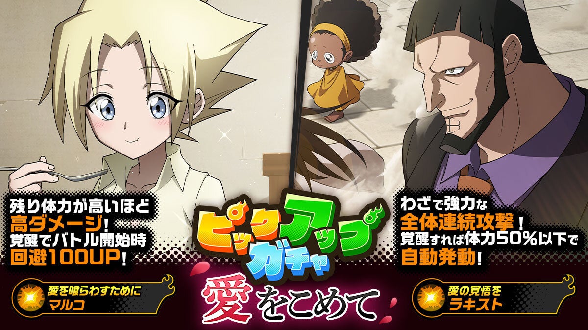 本日、5月24日(火)より、ピックアップガチャ「愛をこめて」を開催いたします。新キャラ「[愛を喰らわすために] マルコ」(CV: 中村悠一)や「[愛の覚悟を] ラキスト」(CV: 松田健一郎)が初登場いたします。期間中は新キャラの提供割合がアップしております。
