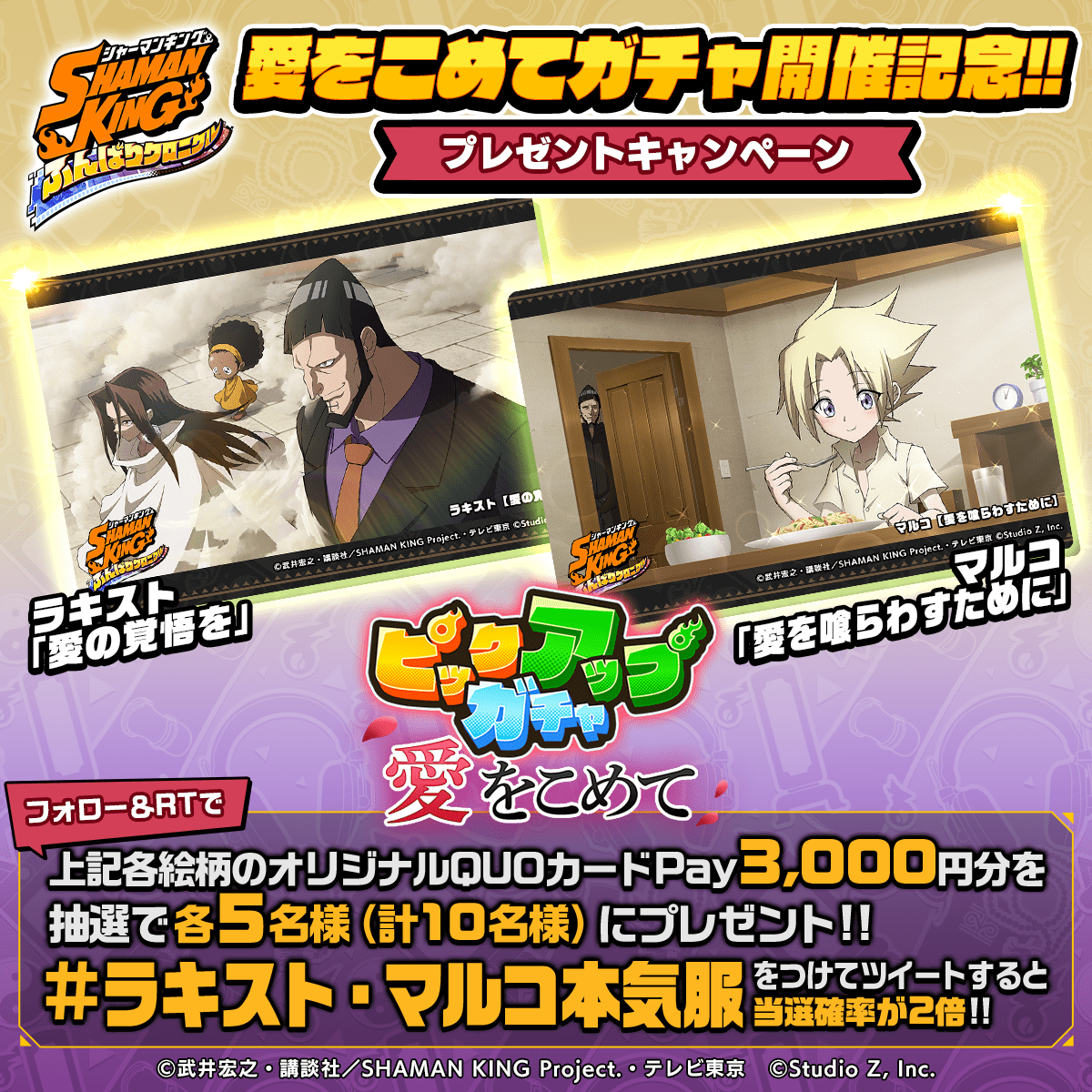 「愛をこめてガチャ」の開始を記念しまして、「オリジナルQUOカードPay」3,000円分が抽選で合計10名様(各5名様)に当たるキャンペーンを開催いたします。「#ラキスト・マルコ本気服」のハッシュタグを付けて投稿すると当選確率が2倍になりますので、是非ともご参加ください!