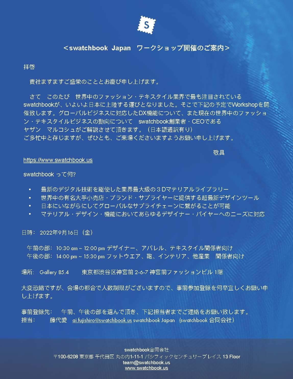 尚、直近では当社主催の生地展示会に合わせて、swatchbook社のメンバーが来日し、9月16日(金)にワークショップを開催致します。