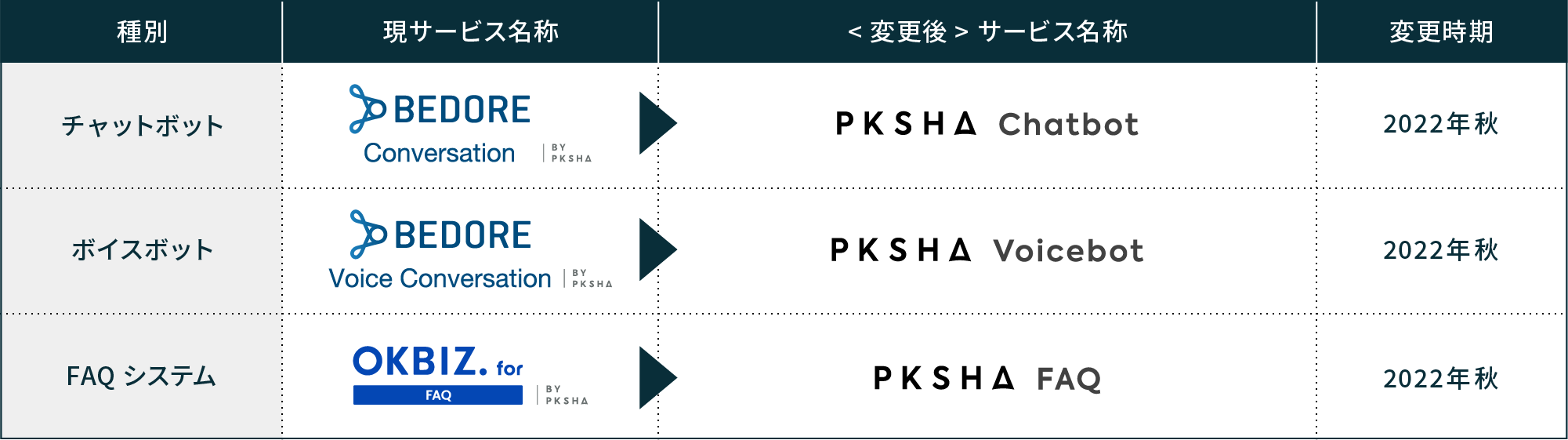 ハイブリッドワークやDXが加速する社会的背景のもと、PKSHAの自然言語処理・音声認識技術を基盤に展開するAI SaaSプロダクトは対応範囲・導入業界共に展開が広がっています。今回、「BEDORE」「OKBIZ.」を「PKSHA」ブランドへ統一する事を皮切りに、2022年内に「PKSHA Communication Cloud」としてのパッケージプランの発表を予定しています。