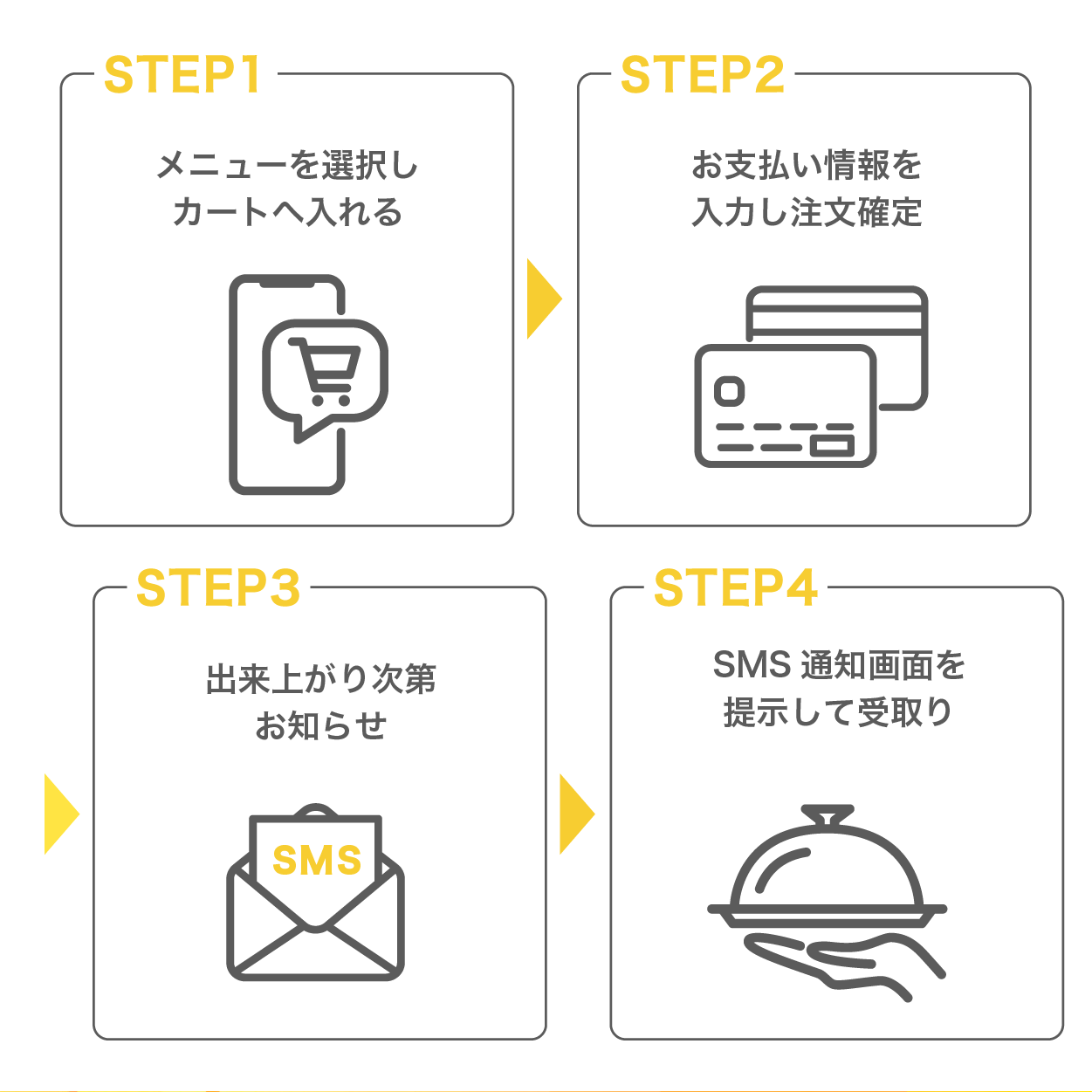 注文時にクレジットカードにて決済を行い、商品の準備が出来次第店舗側からお客様へ準備完了の通知をすることで商品の受け渡しをスムーズに行います。