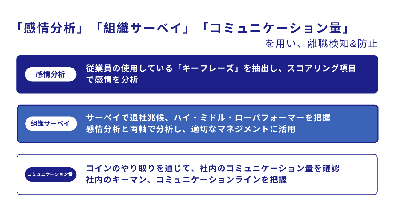データ「感情分析・組織サーベイ・コミュニケーション量」を用い離職を検知&防止