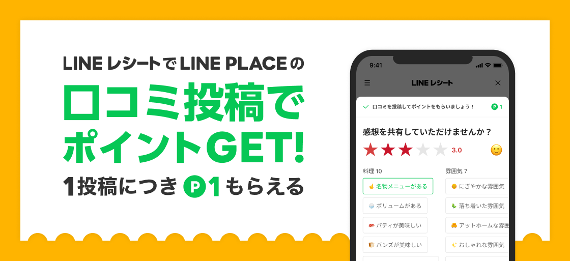 *2「LINEレシート」内での口コミ投稿による報酬LINEポイント1ポイントのほかに、「LINE PLACE」においてさらに詳細の口コミ投稿をすると、投稿内容によって「LINE PLACE」の報酬が別途付与されます。「LINE PLACE」での口コミ報酬の詳細は、「報酬獲得条件の変更に関するお知らせ」( https://place-blog.line.me/update/newincentive2209 )をご覧ください。