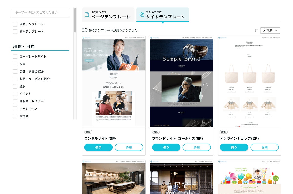 使いたいテンプレートを選択するだけで、2ページ以上のテンプレートが一括でサイト管理機能に反映されるので、1ページずつ追加する手間を省くことができます。