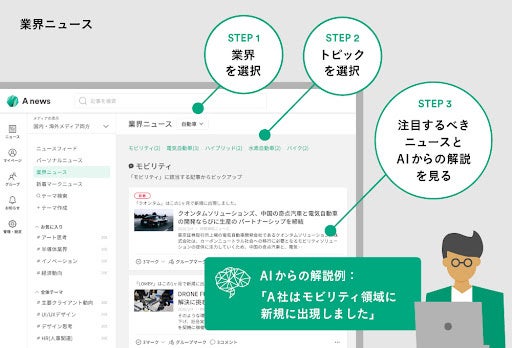 Anewsは国内外約3万5千サイトの膨大な情報から、AIが組織や業務に合わせて必要な情報を届け、組織の情報感度を高める情報収集サービスです。本機能は、新規事業や用途開発を考える上で、知見のない業界を知りたい方、自社業界の変化を知りたい方に向けて、当社が設定した15の業界とその業界でのトピックに関する情報を配信します。本機能によって、企業起点の業界概観や変化をタイムリーに知ることができ、新規事業や用途開発をする上でのアイデア創出を活性化する機能となっております。