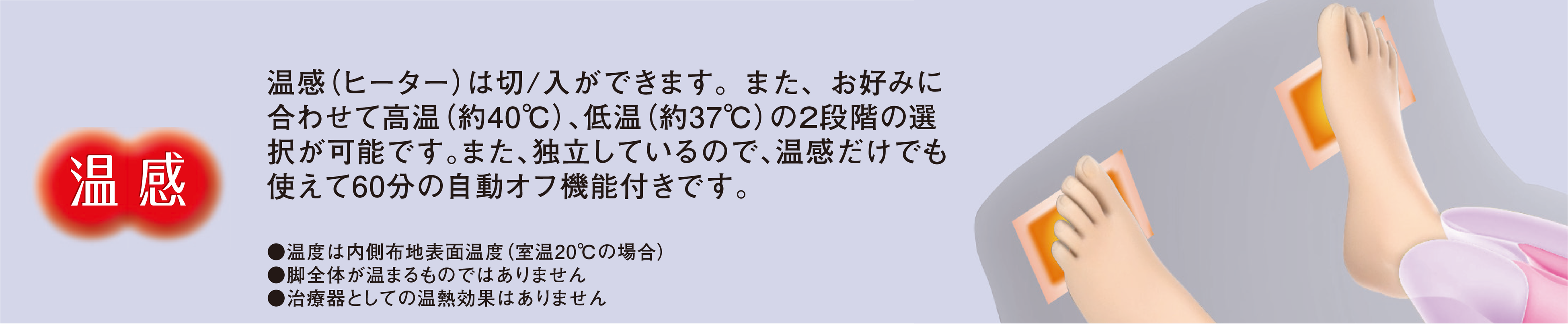 足先にフィットしやすい「線ヒーター」を搭載。ヒーター面積はパナソニックのレッグリフレ(EW-RA190、180)と比較して約3倍。温める範囲が広がりました。マッサージなしの温感機能だけでも最大60分使用可能です。