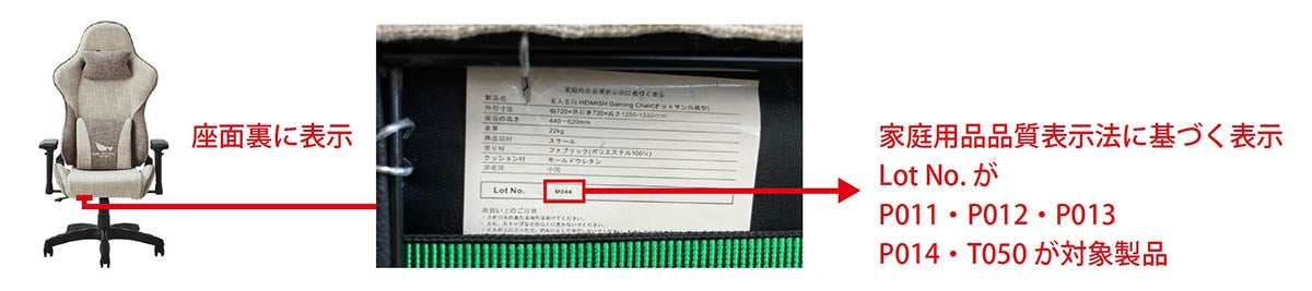 製品の座面裏にございます、「家庭用品品質表示法に基づく表示」にロットナンバー(Lot No.)の記載がございます。※下図もご参照ください。