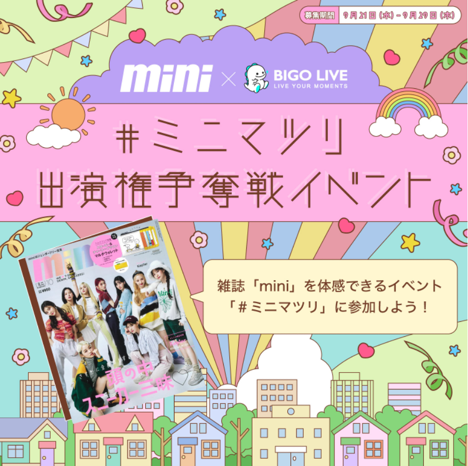 同イベントは、ライブ配信アプリ「BIGO LIVE」内で、期間中毎日開催。イベント参加者は、アプリ内のオーディエンスに向かって、スマホで配信を行うことで得る獲得ポイントの総合点で、順位を競い合います。上位入賞者は、「#ミニマツリ 」のイベントステージ出演者として起用され、「#ミニマツリ」への出演権及び「mini」の誌面掲載権等が授与されます。