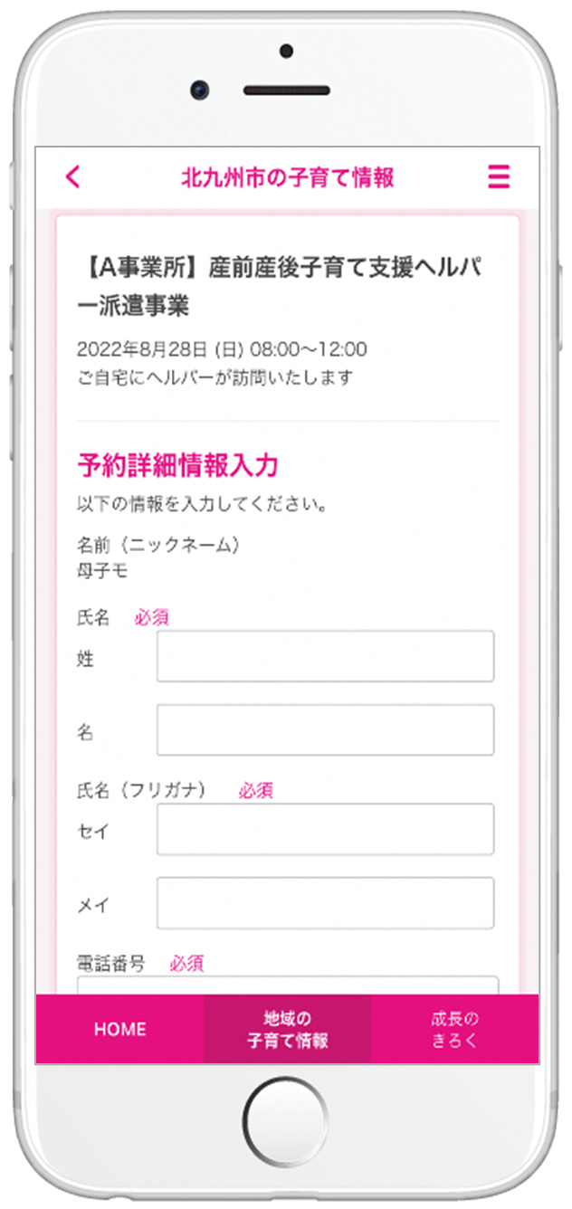 『きたきゅう子育て応援アプリ』各ページの下部にある「地域の子育て情報」メニューを押し、表示された画面の「産前産後子育て支援ヘルパー派遣事業」のバナーを選択します。予約ページが表示されたら、利用を希望する日時を選択し、氏名や連絡先、希望する援助内容などを入力して予約します。予約後に、ヘルパー事業所の担当者から電話が入り、電話で予約内容の確認後、予約が完了します。