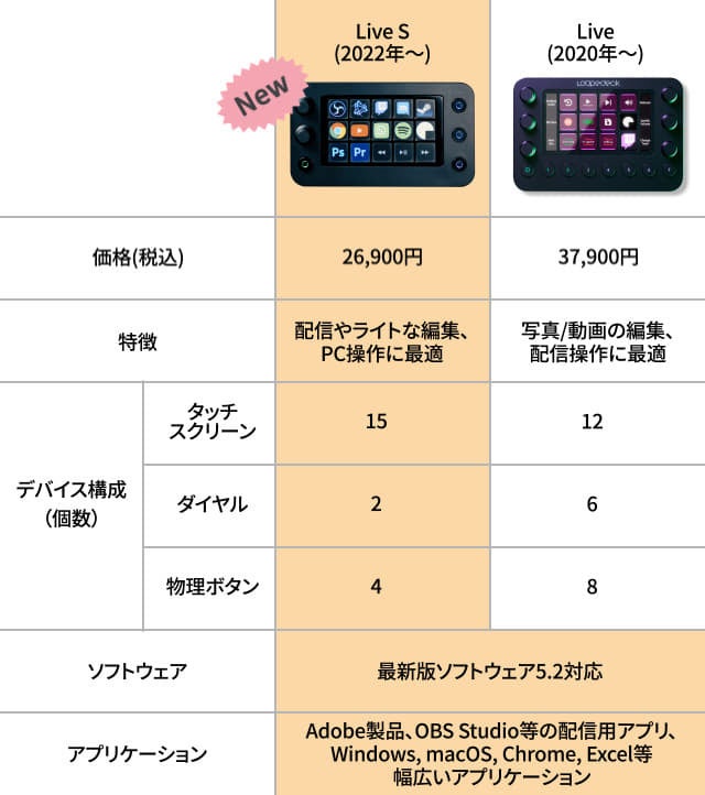 人気機種のLoupedeck Live と比較して、ソフトウェアや対応アプリケーションはそのままに、1万円以上のコストダウンを実現しました。