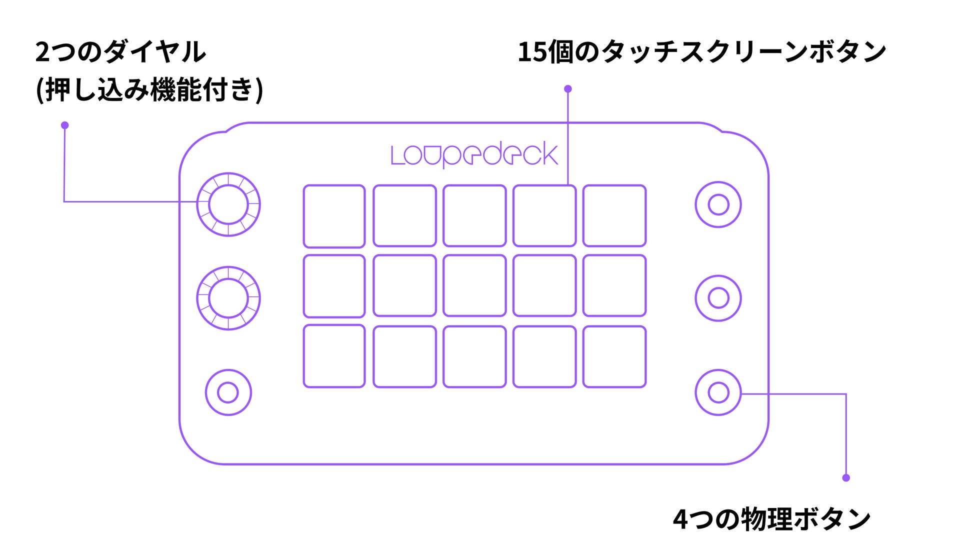 押し込み機能のあるダイヤルを2個、頻度の高いアクションに便利な物理ボタンを4個、ショートカットやマクロを割り当てるタッチボタンを15個搭載しました。