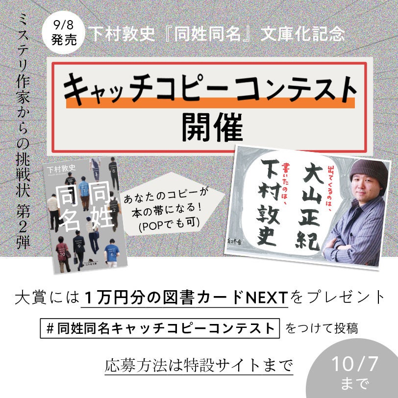2022年9月8日(木)発売、下村敦史『同姓同名』文庫化記念キャッチコピーコンテストを開催いたします。