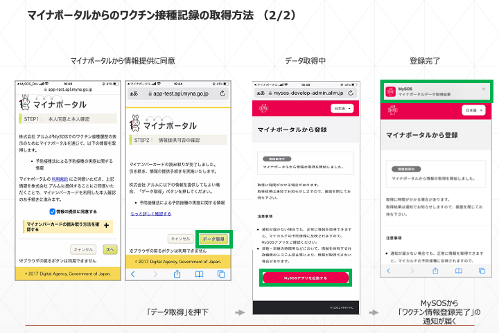 この度、MySOSへマイナポータルから取得した公的な新型コロナウイルスワクチンの接種記録が登録できるようになったことにより、より信頼できるPHR(Personal Health Record)データを搭載したデジタルヘルスパスポートとして、ご利用いただけるようになりました。 アルムでは、引き続きMySOSのPHR機能を強化することで利便性を高める予定です。