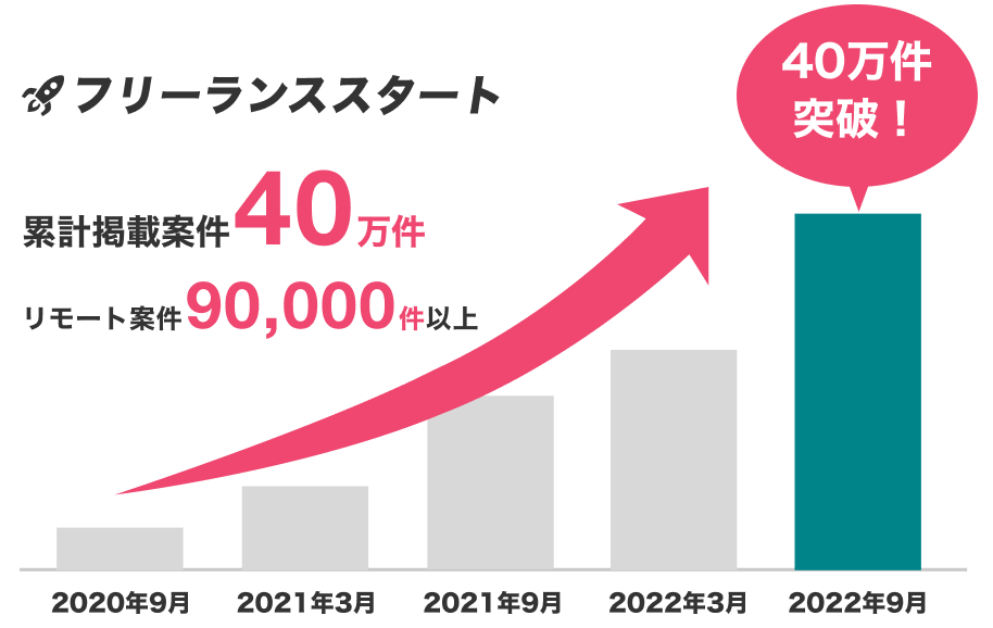 2022年9月時点、フリーランススタートではリモートワーク可能な案件を90,000件以上取り扱っており、さらに6ヶ月間でリモートワーク案件は約40,000件増加しています。