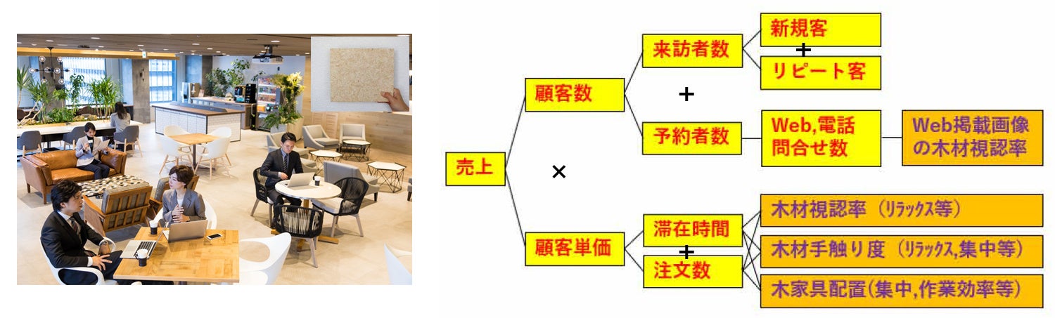 実証概要:コワーキングスペース実店舗で木質化前後で現地滞在時間の計測を実施し、木質化が売上・顧客単価・滞在時間・視線や脳波に影響を与えているかを実験
