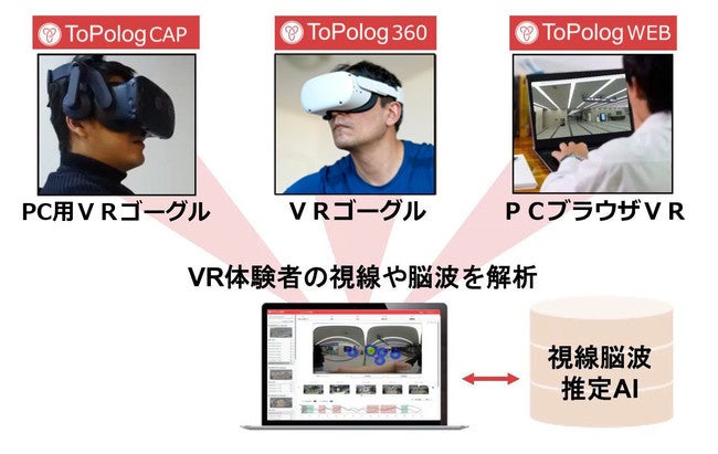 ToPologは、VRのソフトやデバイスを限定せず、VRやデジタルツインに関連付けて空間体験データをクラウドに保存することができるSaaS型ツールです。CAP・360・WEBの3種のモードを備えており、設計検討や現地調査や現地運用のVRから、視線や脳波を、実測やAI推定することで、空間体験価値を定量化し、デザインの効率や品質を向上させることができます。