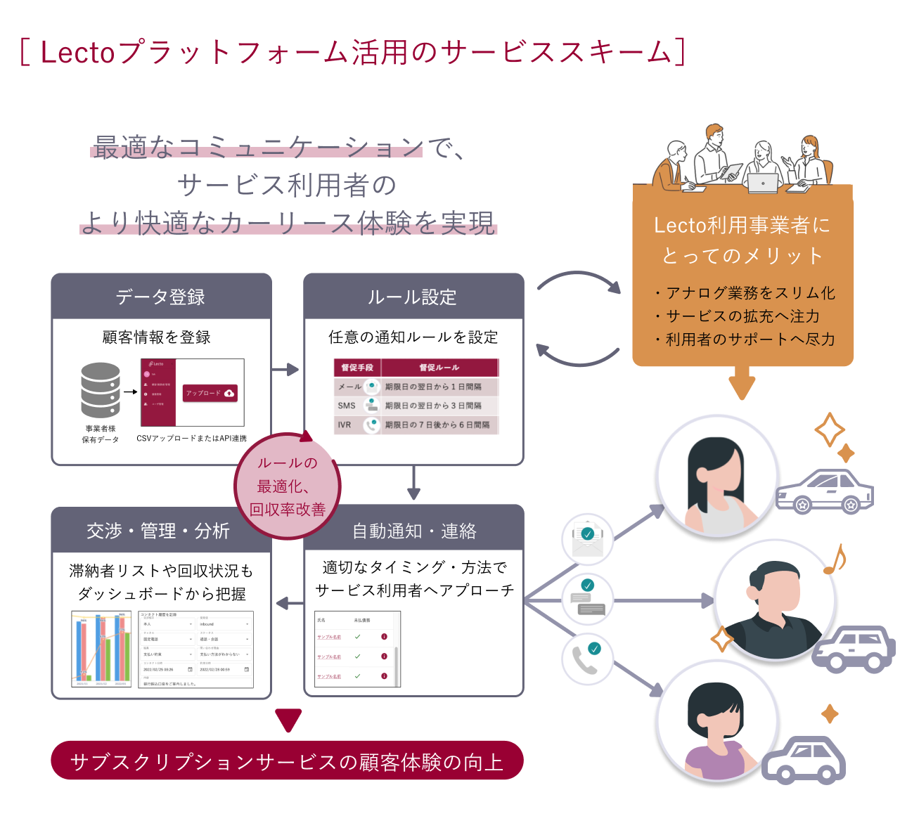 Lectoはナイルが提供する「おトクにマイカー 定額カルモくん」における債権管理・支払いリマインド業務を効率化させることを通じて、ご利用ユーザーのコミュニケーション体験の向上をサポートし、より快適なカーリース体験の実現に貢献いたします。