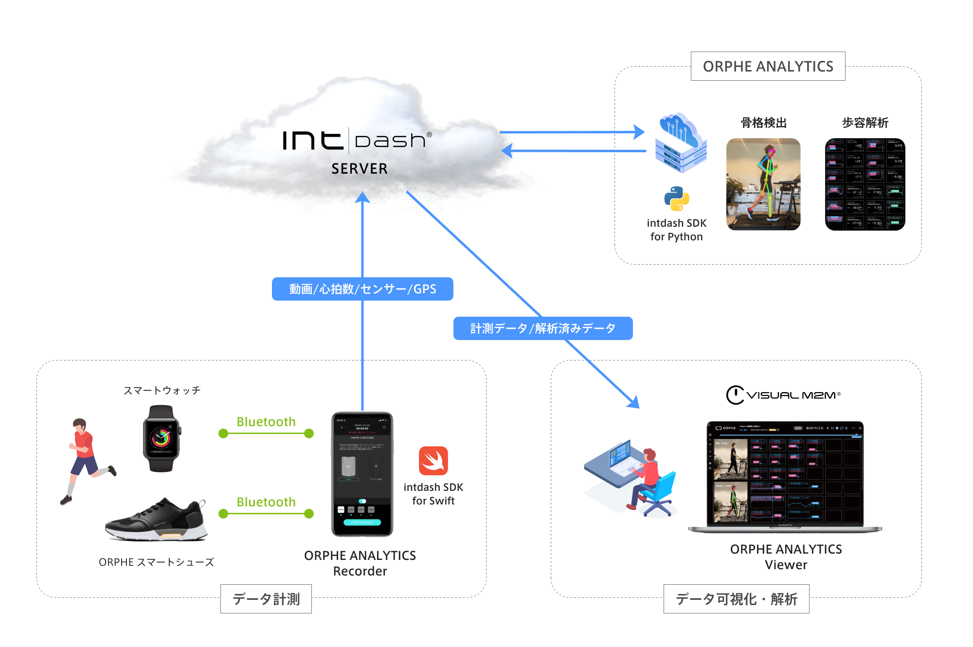大容量データのストリーミング環境を実現する『intdash』と、オルフェが提供するセンサーデバイス『ORPHE CORE』とデータ収集アプリ『ORPHE ANALYTICS』を連携することで、intdash の時系列データストアに蓄積されるセンサー/心拍/動画データをリアルタイムに分析・可視化し、リハビリテーションや歩行/走行指導に利用できます。