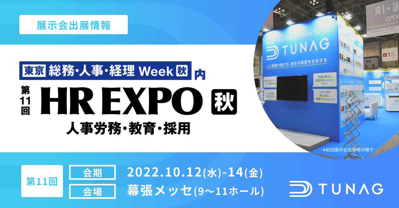 会期中当社ブースでは、組織の信頼関係の構築とコミュニケーション課題の解決を実現する、エンゲージメントプラットフォーム「TUNAG」のPC版とスマホ版のデモンストレーションをご用意しており、実際にサービスに触れていただけます。会期中は企業規模・業界を問わず企業のエンゲージメント向上を支援してきた担当者がサービス概要や機能、活用例をご説明させていただきます。