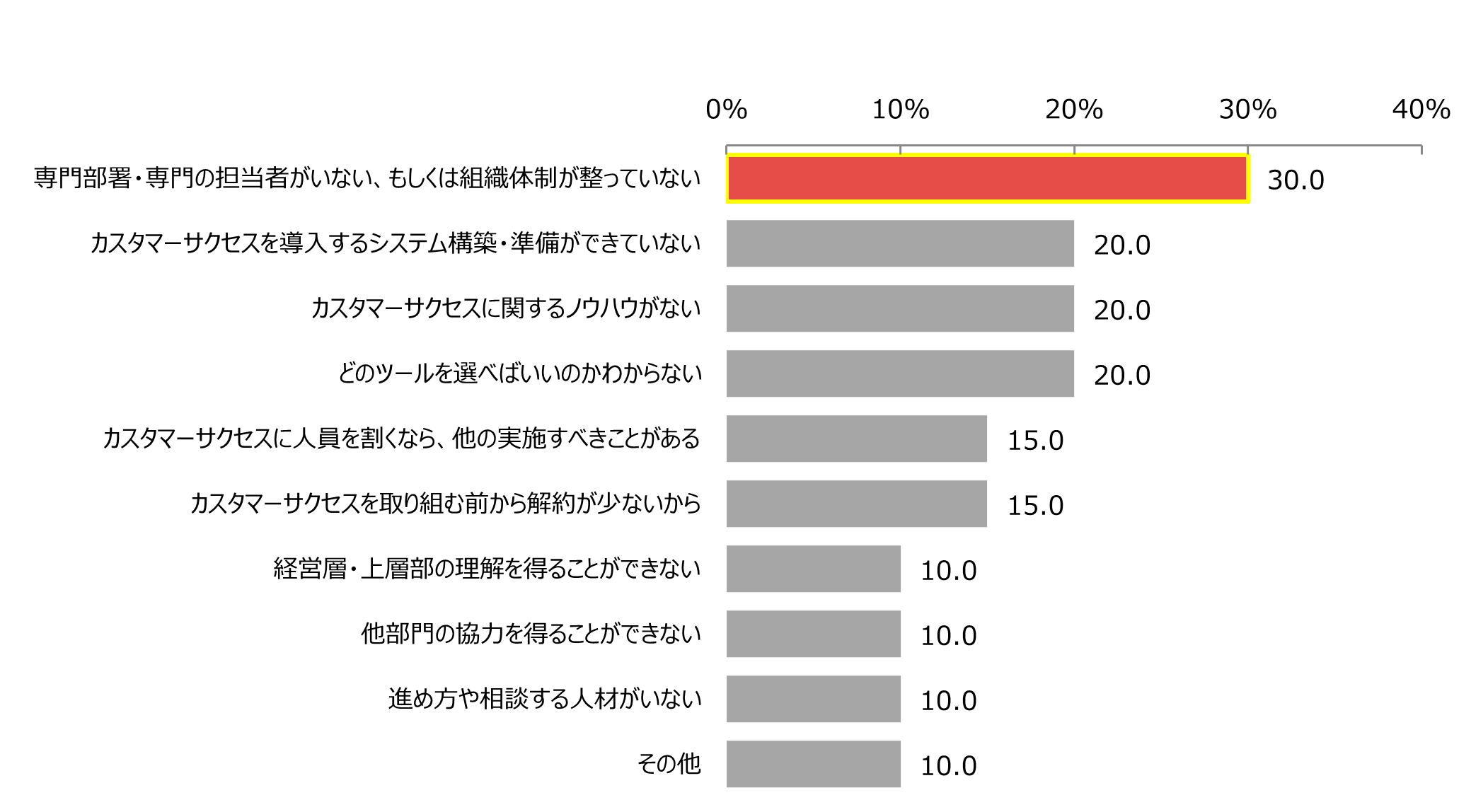 カスタマーサクセスに取り組まない理由としては「専門部署・専門の担当者がいない、もしくは組織体制が整っていない」という回答がもっとも多く、既にカスタマーサクセスに取り組んでいる企業の「人員不足・ノウハウ不足」という課題と同じ傾向となっています。