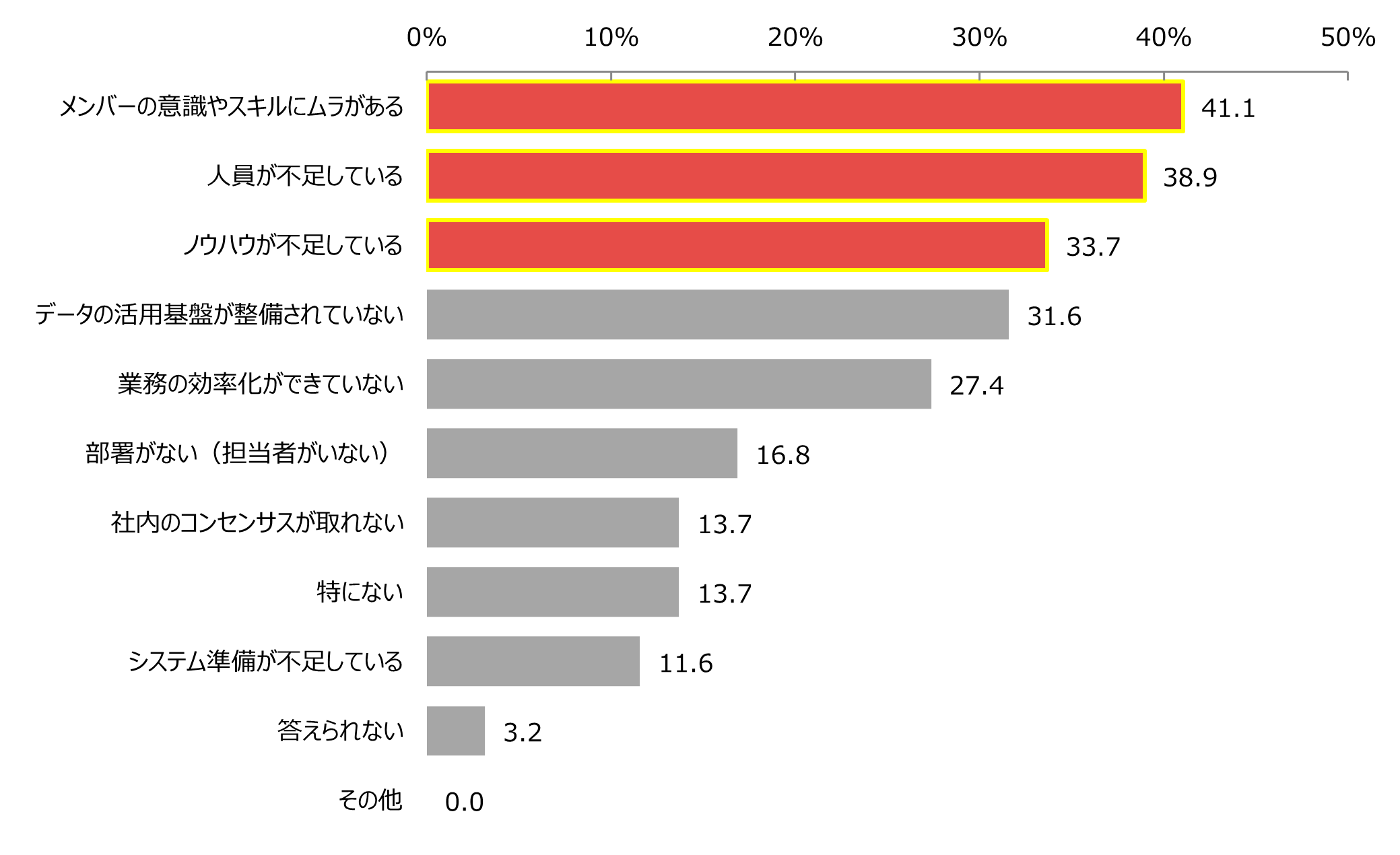 一方、実際に取り組むなかで発生している課題は「組織」「ノウハウ」に関連する内容に集中していると判明。