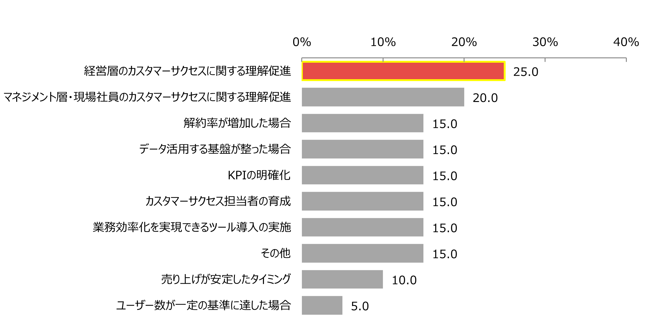 現在、カスタマーサクセスに取り組む予定のない担当者が取り組むための条件は、「経営層のカスタマーサクセスに関する理解促進(25.0%)」や「マネジメント層・現場社員のカスタマーサクセスに関する理解促進(20.0%)」を挙げた回答が多い結果となり、組織内での理解促進の重要性がうかがえます。