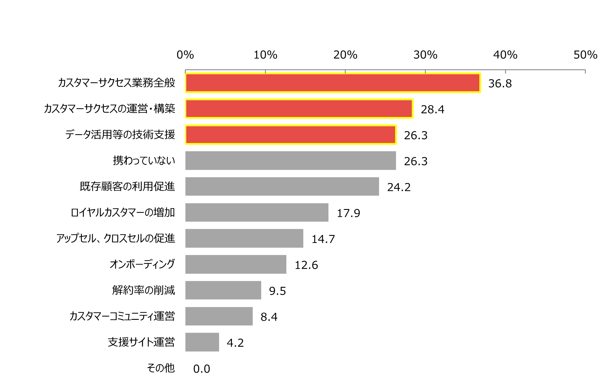 現在携わっているカスタマーサクセスの業務内容は「カスタマーサクセス業務全般(36.8%)」と「カスタマーサクセスの運営・構築(28.4%)」が多く、次に「データ活用等の技術支援(26.3%)」が多い状況です。