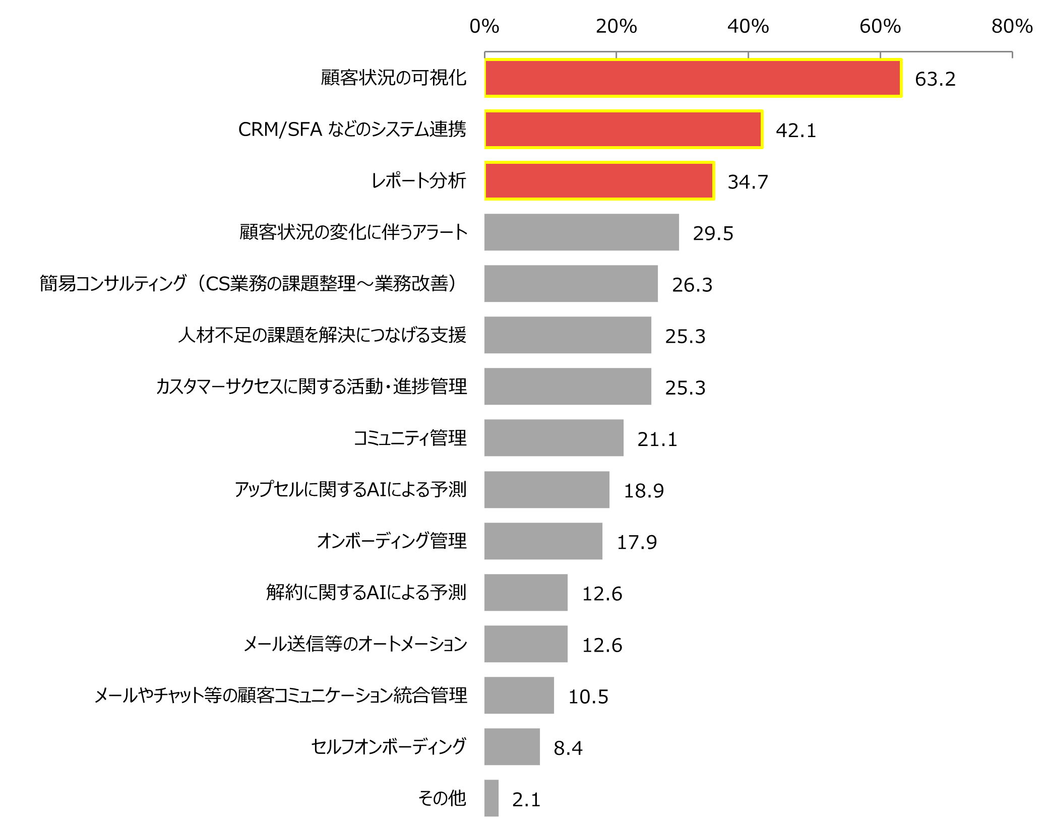 「カスタマーサクセスツール」で興味がある機能・サービスは「顧客状況の可視化(63.2%)」がもっとも多く、「CRM/SFA などのシステム連携(42.1%)」「レポート分析(34.7%)」が続いています。