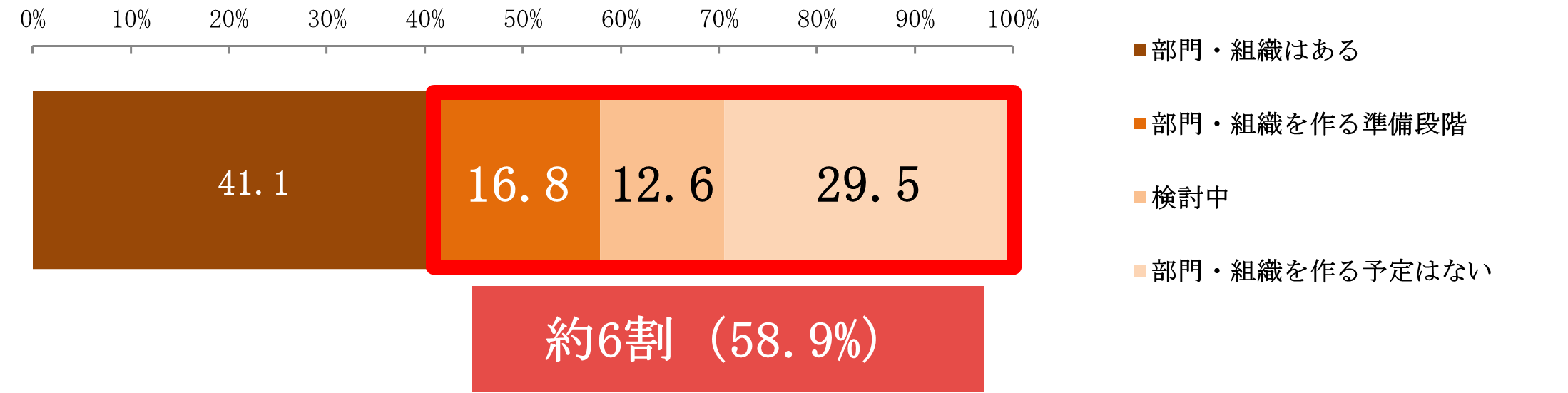 約4割(41.1%)が「部門・組織がある」と回答したものの、約6割(58.9%)が現状「部門・組織」がなく、なかでも約3割(29.5%)が「部門・組織を作る予定はない」と回答しています。
