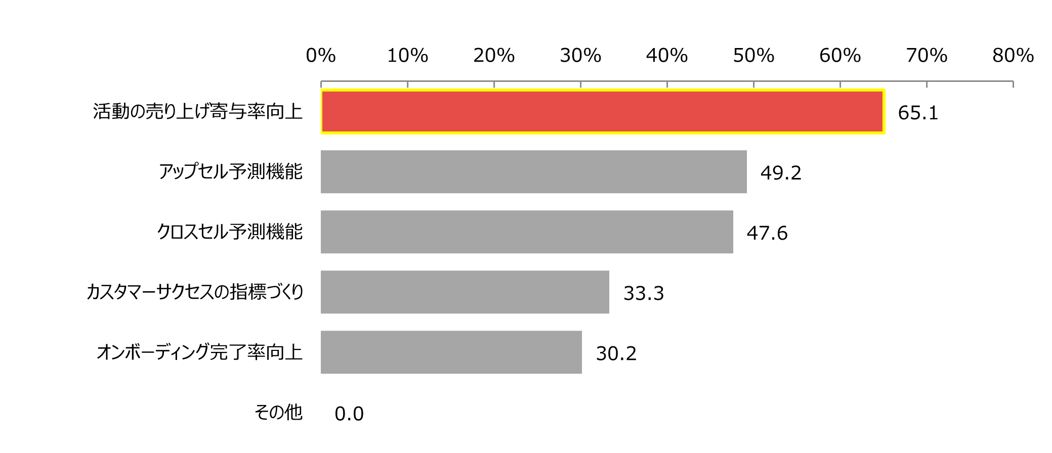 「カスタマーサクセス」において「積極的にデータを活用していきたい」という回答が6割以上(66.3%)を占めました。また、データの活用方法としてもっとも関心の高い項目は「活動の売り上げ寄与率向上(65.1%)」となっています。