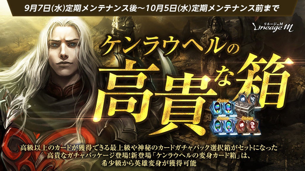 使用すると定められた確率で希少級~英雄級変身カードが獲得できる「ケンラウヘルの変身カード箱」と、変身かマジックドールを選択してガチャ券を獲得できる「最上級カードガチャパック選択箱」、「神秘のカードガチャパック選択箱」、「上級カードガチャパック選択箱」を複数個獲得でき、更に職業に対応した一般~英雄級のスキルカードがそれぞれ定められた確率で獲得できる「スキルカードガチャパック箱(イベント)」がセットになった「ケンラウヘルの高貴な箱」が登場しました。